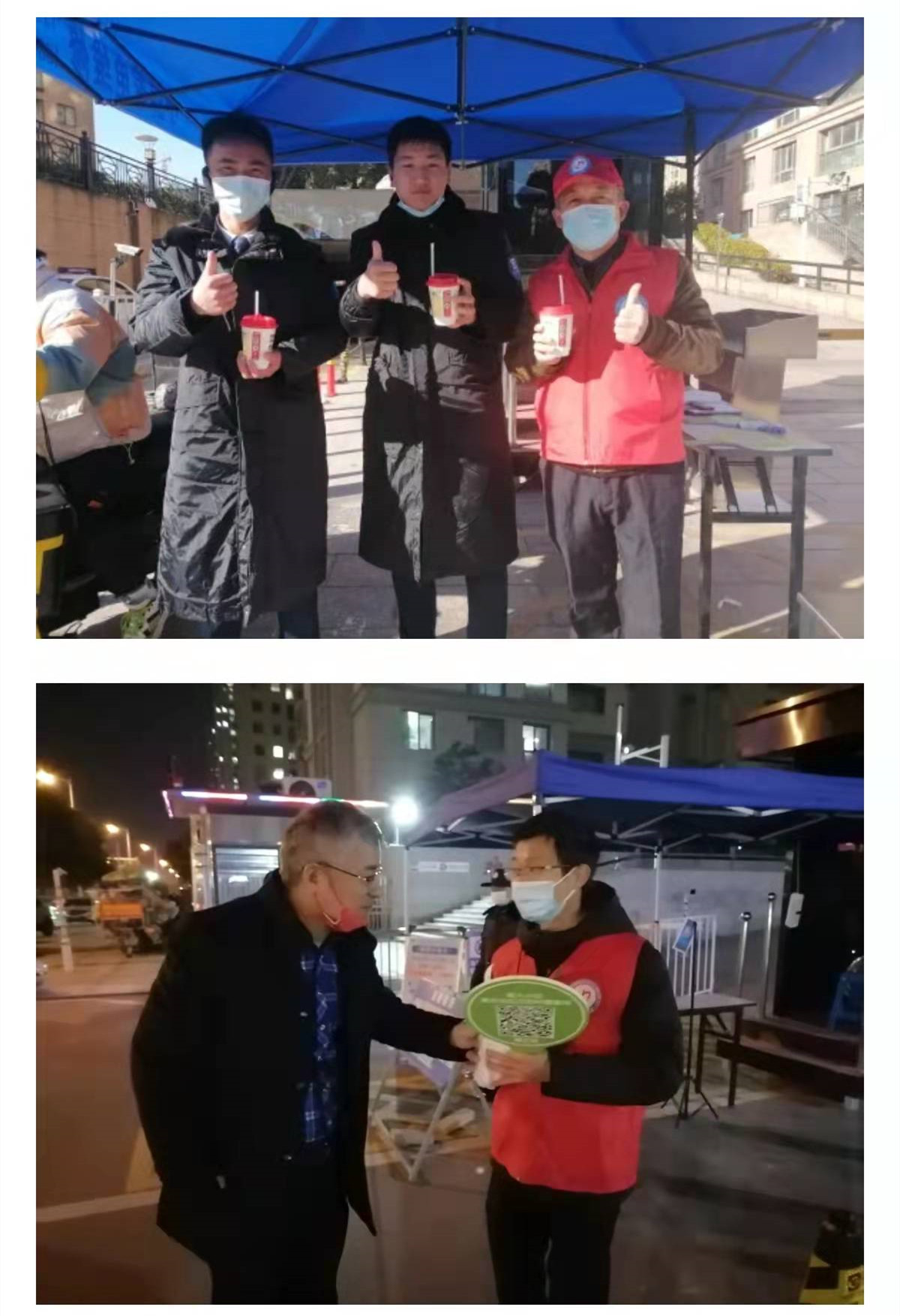 ▲暖心時(shí)刻:熱心市民為志愿者送熱豆漿;委托社區王主任為志愿者送熱奶茶